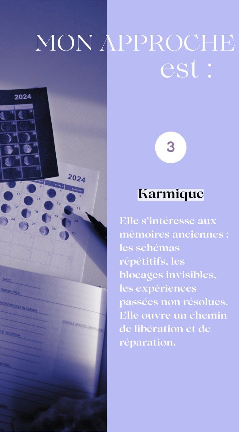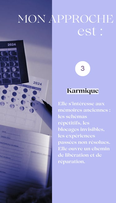 Elle se concentre sur la vie directement antérieure, les dettes karmiques et le but spirituel de cette vie. Il faut garder en tête que le karma n'a rien de punitif, il fait simplement état d'un rééquilibrage.